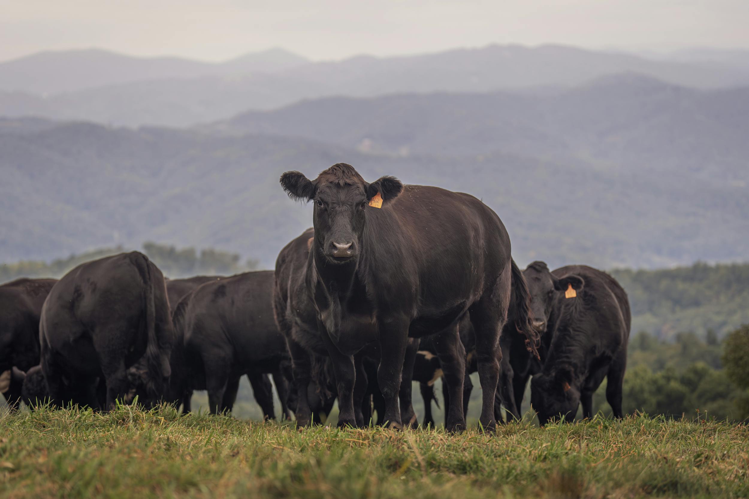 A herd of black cattle grazing on a grassy hillside with a mountain backdrop.